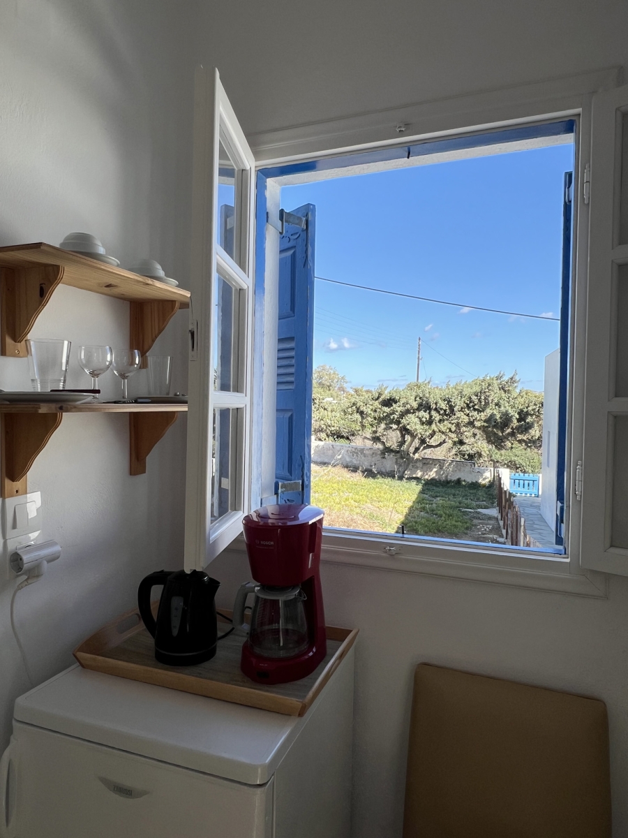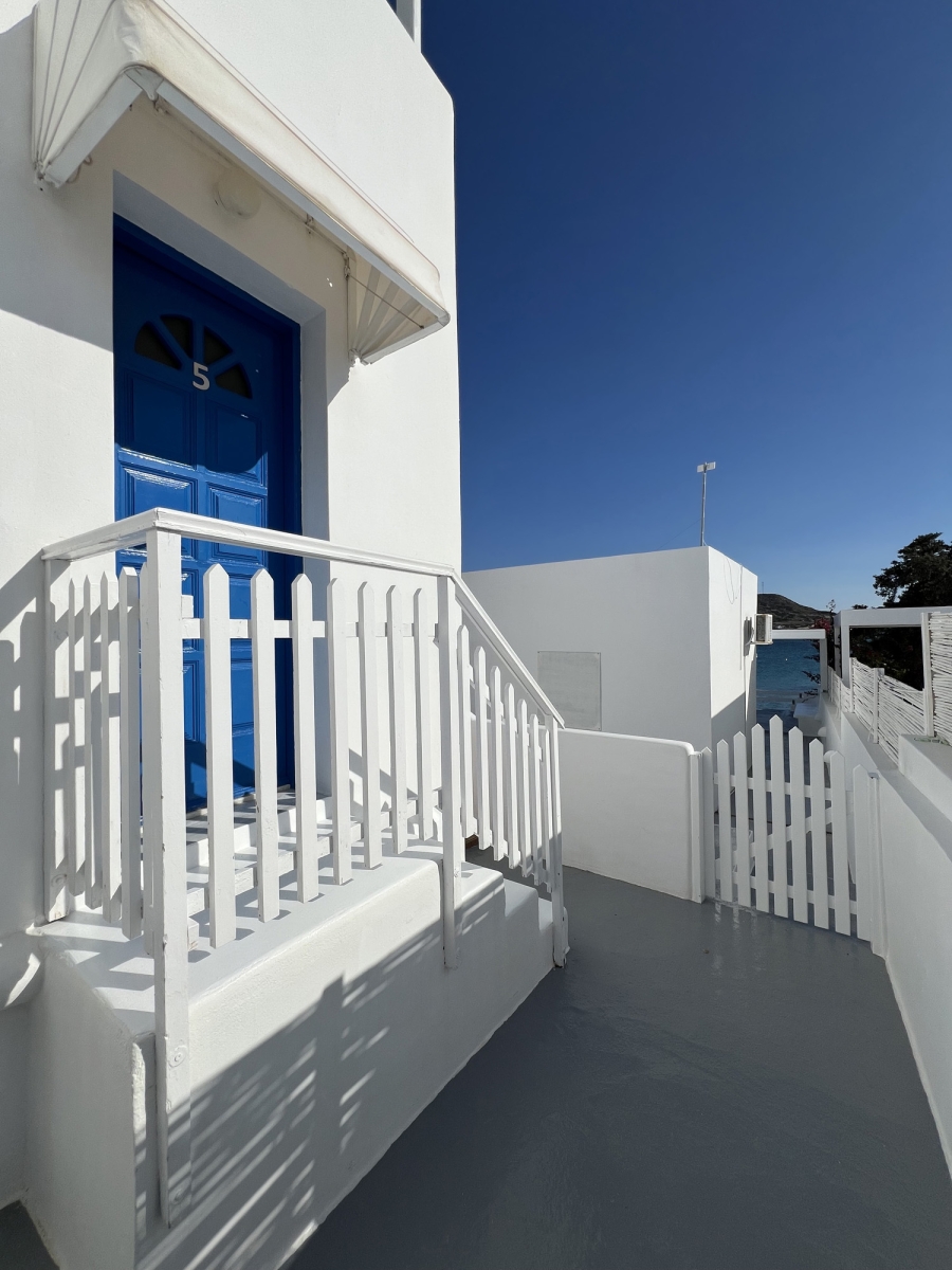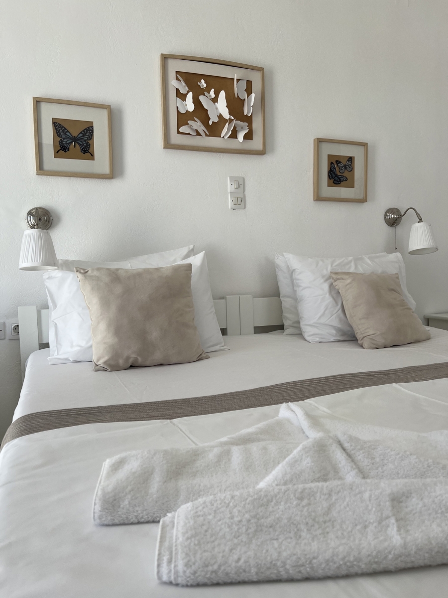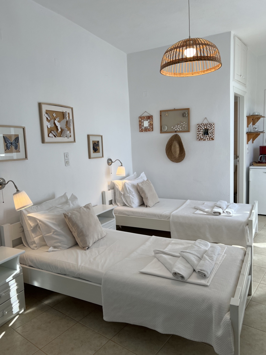 Modern double rooms located on the ground floor. Their design is fully suited to accommodate two adults. The simple lines and earthy tones of the interiors embody the classic Cycladic style, creating the perfect ambiance for a serene and pleasant stay.