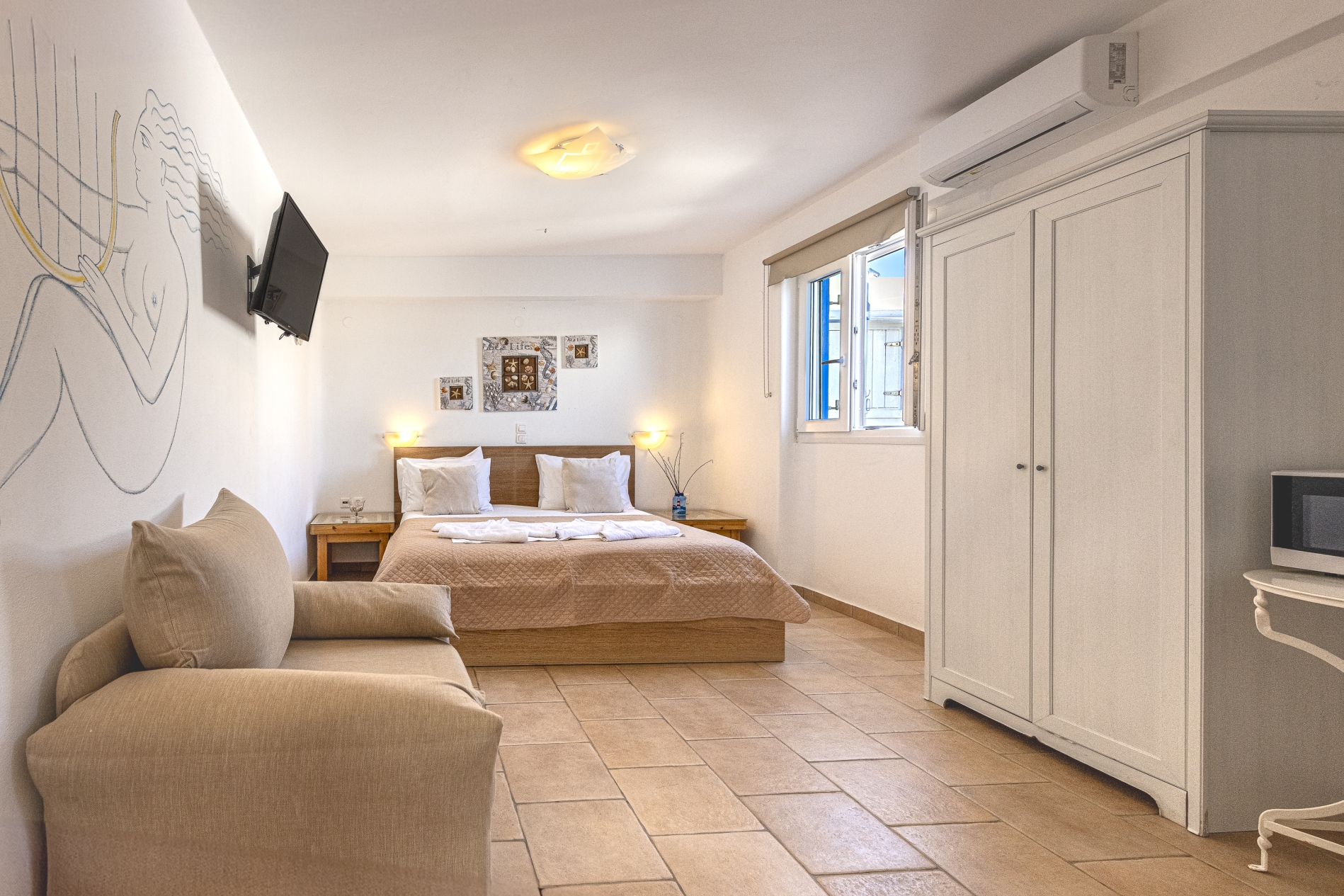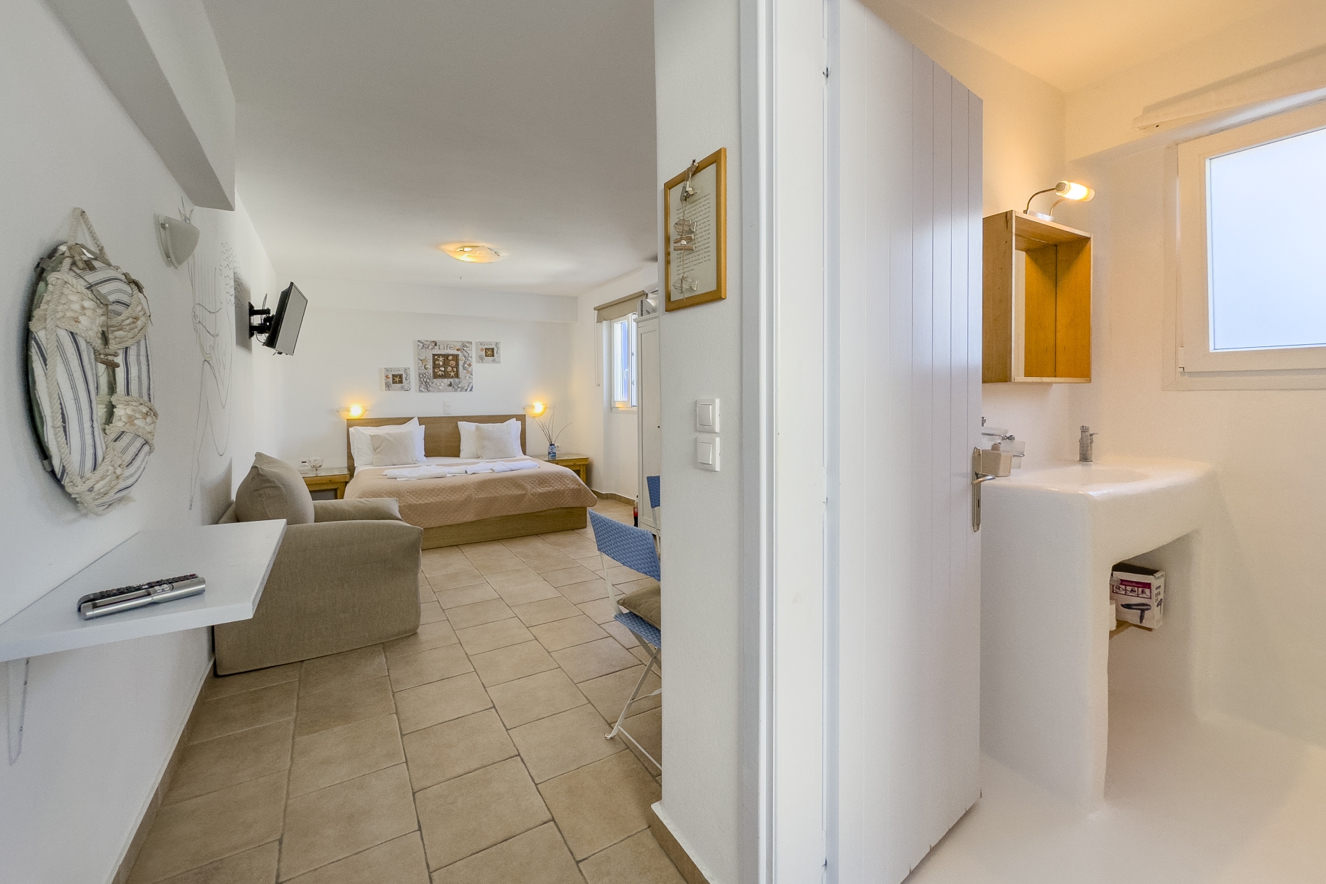 Το απλό είναι όμορφο! Το Στούντιο είναι ένα άνετο, απλό, με διπλό κρεβάτι και πολυθρόνα (που μετατρέπεται σε ένα μονό κρεβάτι). Η κουζίνα είναι πλήρως εξοπλισμένη για ένα πλήρες πρωινό που θα προετοιμάσετε μόνοι σας (ψυγείο, βραστήρα, τοστιέρα, καφετιέρα). Το άσπρο, άνετο μπάνιο ακολουθεί τη χαλαρωτική ατμόσφαιρα του δωματίου.