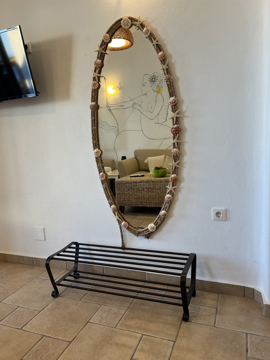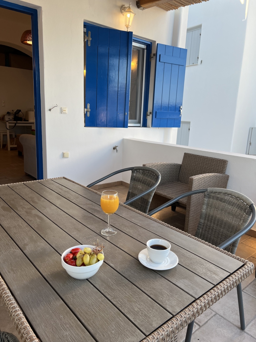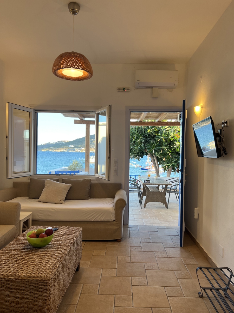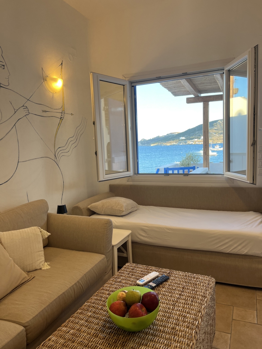Il candido colore bianco delle Cicladi crea un'atmosfera suggestiva, insieme agli eleganti mobili in stile antico dell'appartamento Gorgo. Godetevi un soggiorno rilassante in un bilocale, con una cucina completamente attrezzata per la vostra comodità. La camera principale dispone di un letto matrimoniale e il confortevole soggiorno dispone di 2 divani, che si trasformano facilmente in 2 letti singoli.