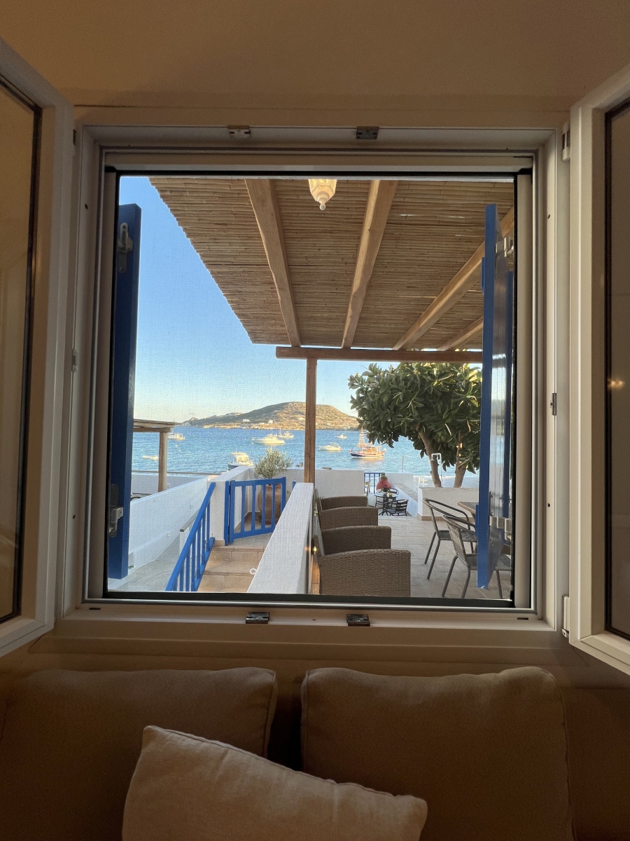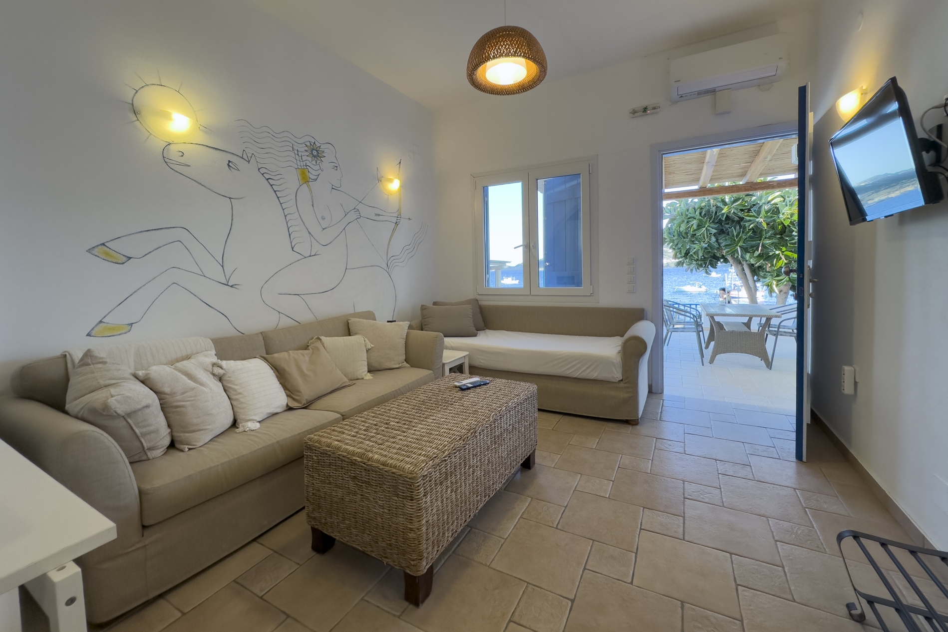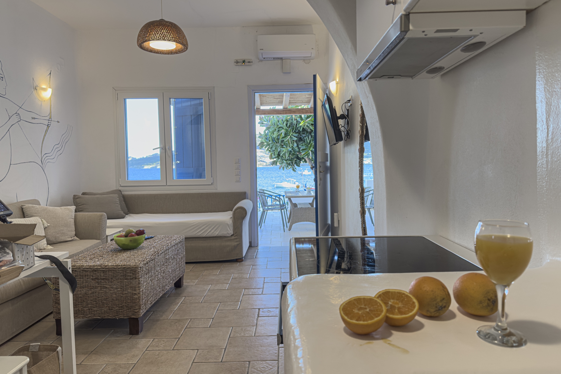 Il candido colore bianco delle Cicladi crea un'atmosfera suggestiva, insieme agli eleganti mobili in stile antico dell'appartamento Gorgo. Godetevi un soggiorno rilassante in un bilocale, con una cucina completamente attrezzata per la vostra comodità. La camera principale dispone di un letto matrimoniale e il confortevole soggiorno dispone di 2 divani, che si trasformano facilmente in 2 letti singoli.