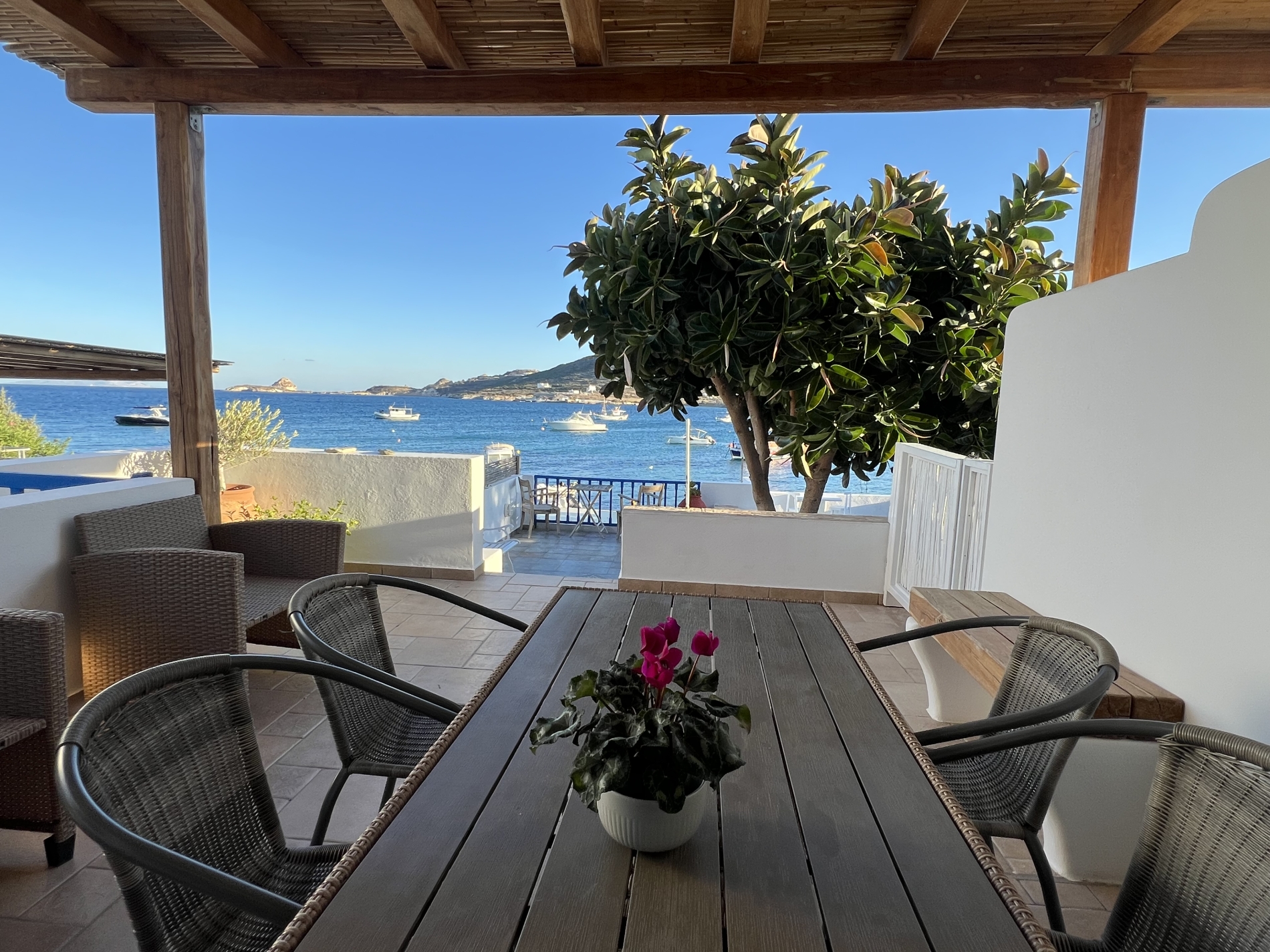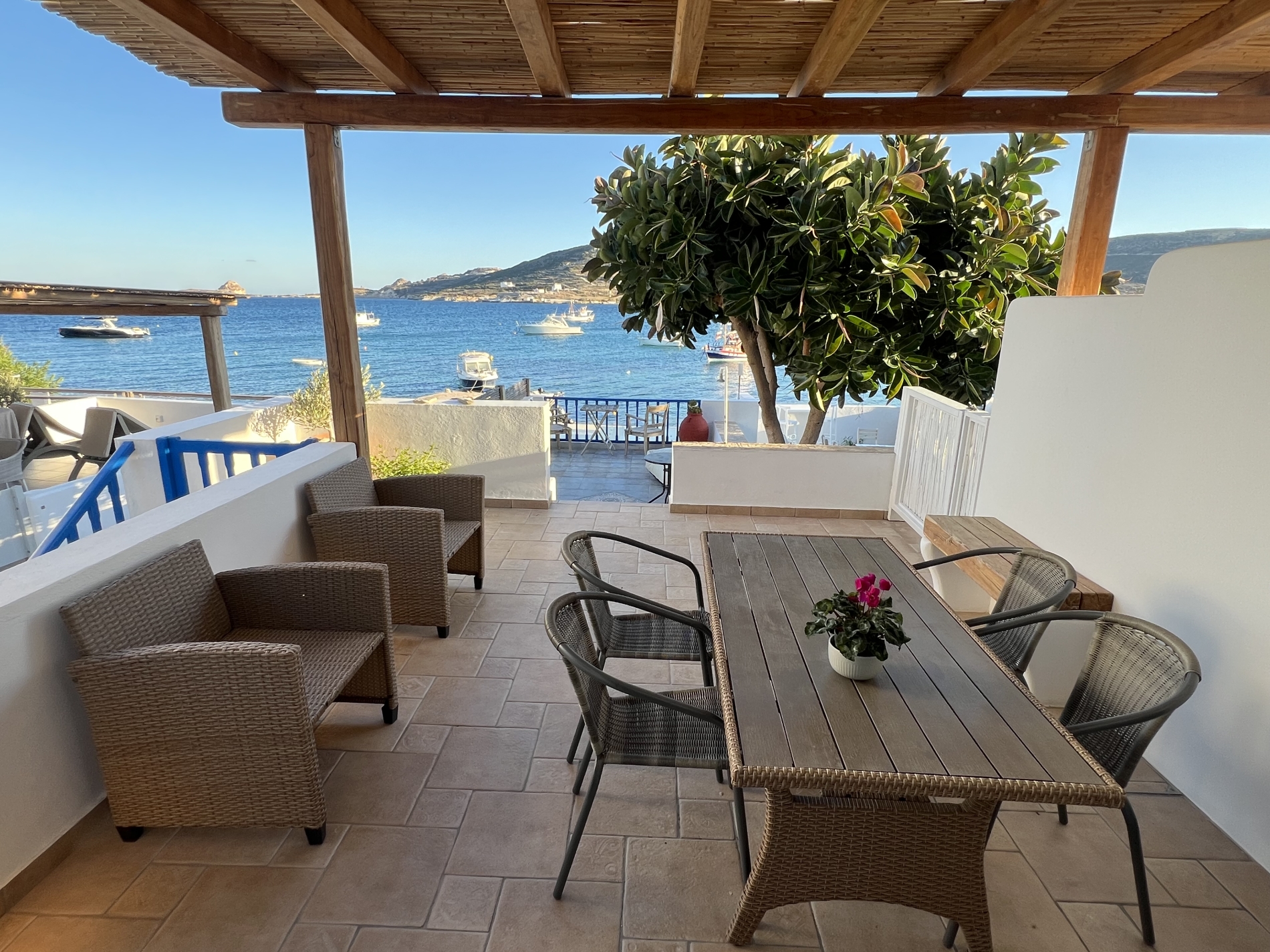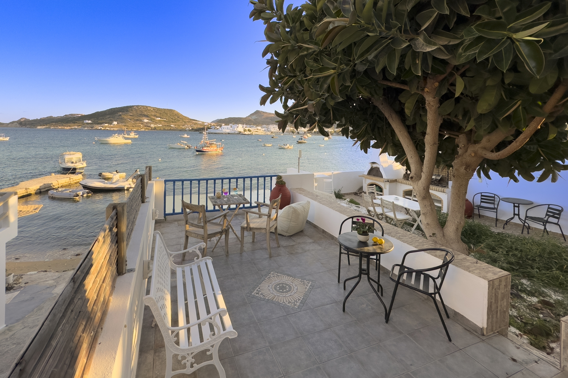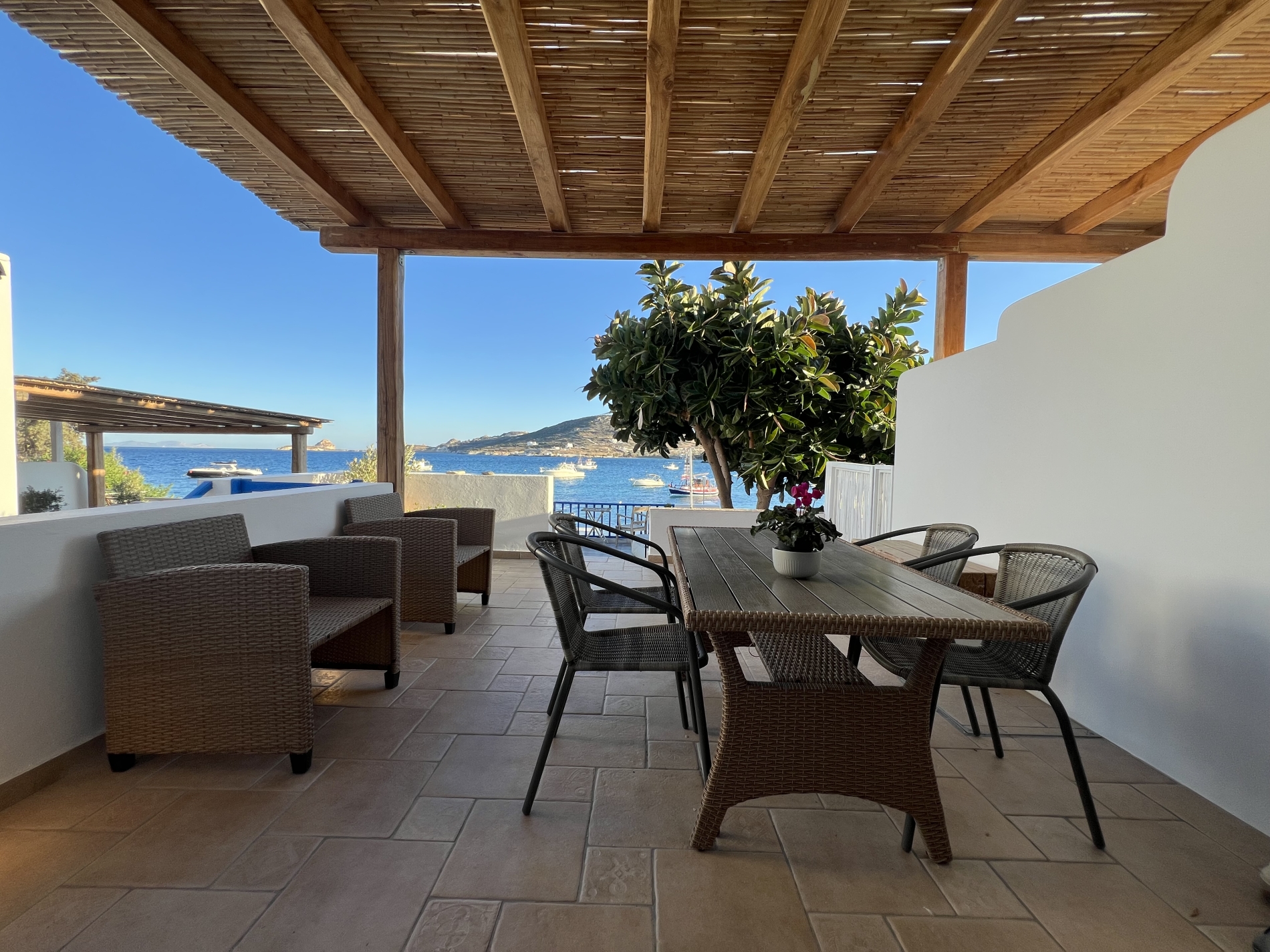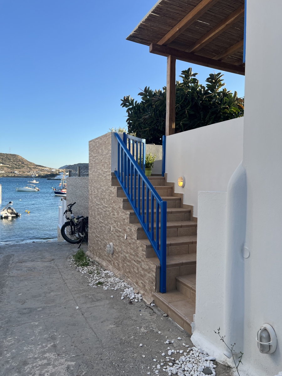 Anche il bagno è arredato in stile cicladico soleggiato. La veranda si apre su una fantastica vista mare, con un giardino privato dotato di barbecue e forno a legna.