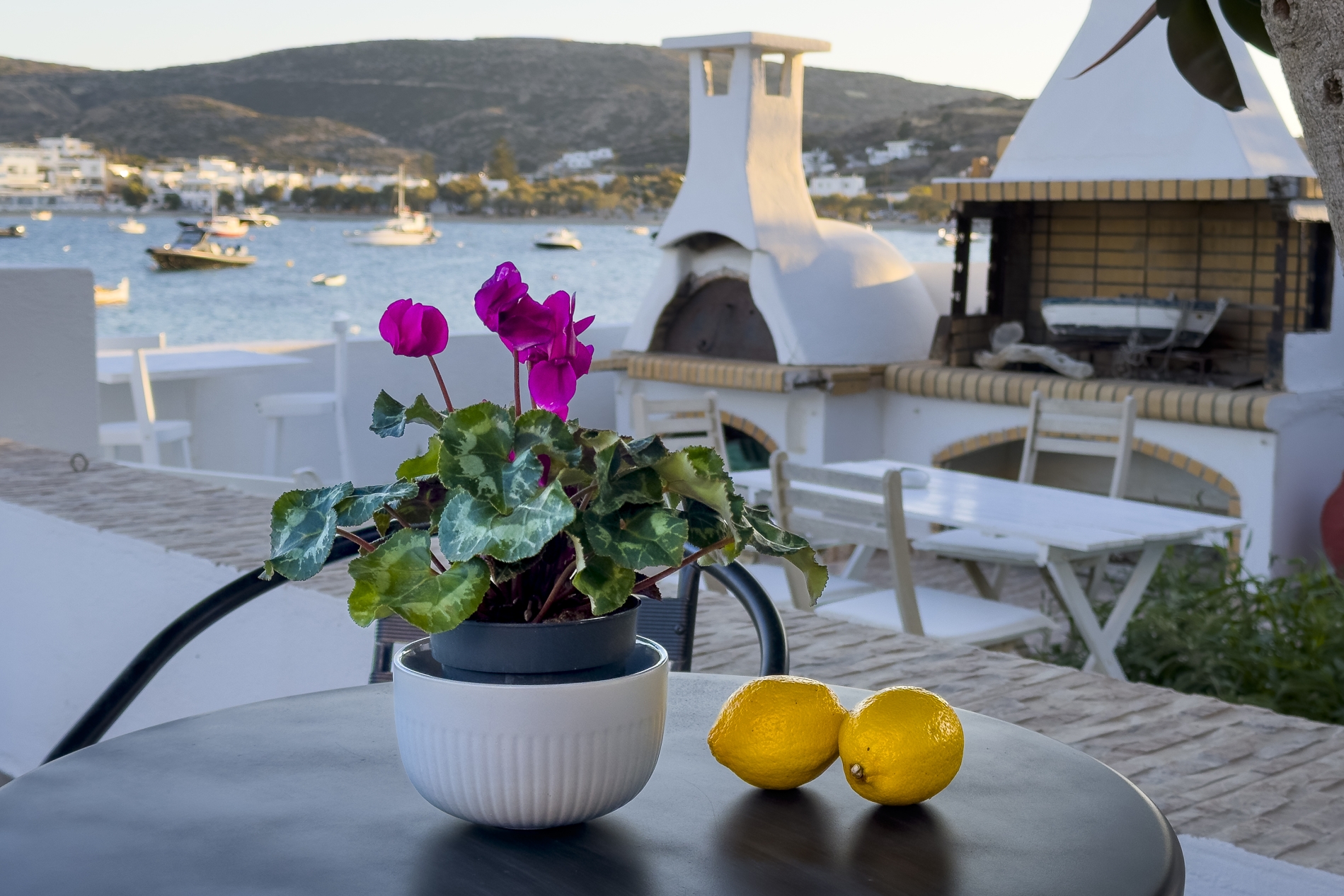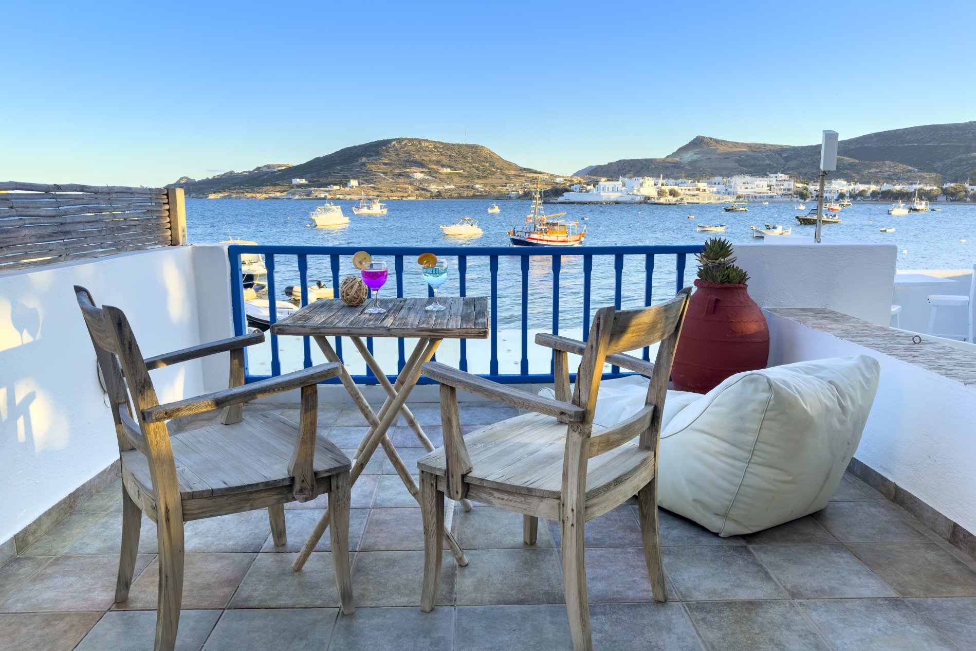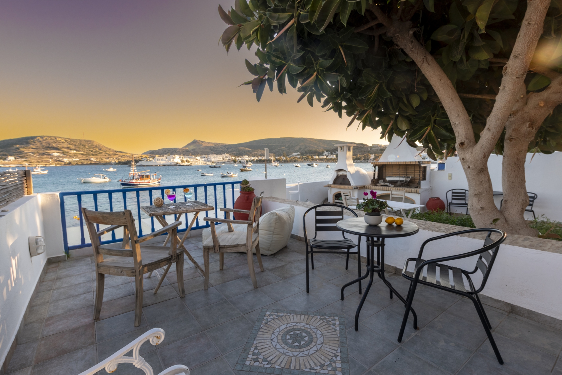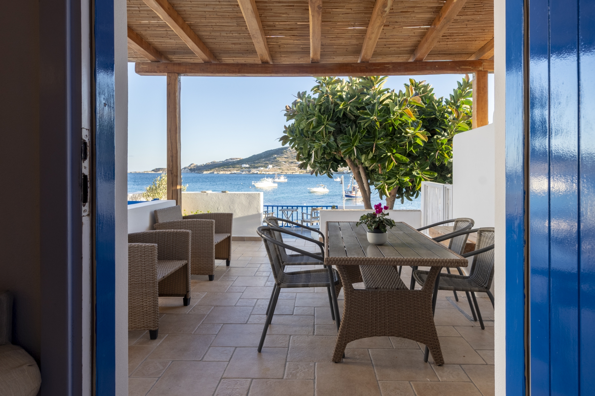 Anche il bagno è arredato in stile cicladico soleggiato. La veranda si apre su una fantastica vista mare, con un giardino privato dotato di barbecue e forno a legna.